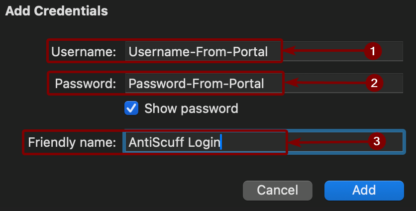 Input the Username and Password as found within the Client Portal. Friendly name can be anything.