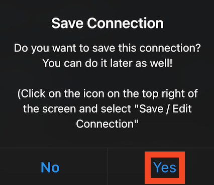 Press Yes if you want to save the connection so you can connect quickly next time you need it (Recommended)