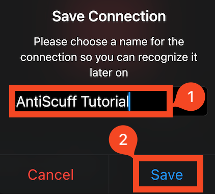 Enter the name you would like to save the connection under(1), then press Save(2)