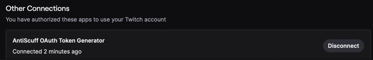 All you need to do is go here: https://www.twitch.tv/settings/connections and look for ‘AntiScuff OAuth Token Generator’ under ‘Other Connections’ and press Disconnect