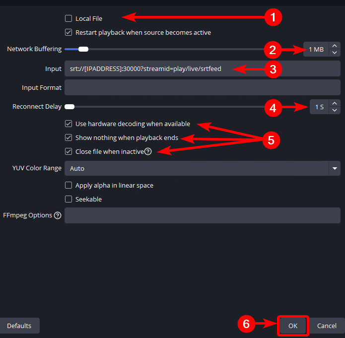 IMPORTANT: Ensure your media source looks the same as the above, with the exception of number 3, which should be your URL from the dashboard!