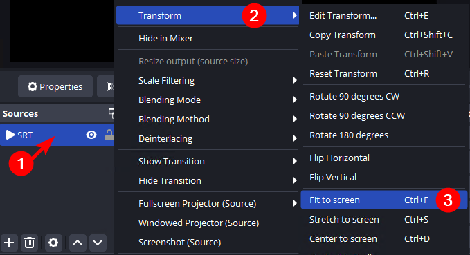 Back in the Sources list, right click on the newly created Media Source (1), go to “Transform” (2) and click “Fit to screen” (3)